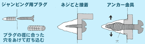 この場合は、ガラスやコンクリート用の穴あけピットを、ドリルにつけて穴をあけ、アンカー金具(ネジの回転により壁の中でプラスチックがねじれて太くなり、内壁の穴にくいこむ)かコンクリートクギを利用するといいでしょう。 同様に、二液型接着剤で、棚受け金具を木ネジごと接着する方法もあります。また、プラスチックの充てん用パイプ(ジャンピング用プラグ)を壁に打ち込み、その穴に木ネジどめをすることもできます。 |