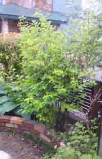 ジューンベリーの樹形 葉はそれほど密に茂らないので、木漏れ日のある木陰をつくるのに適しますが、背が高くないので庭全体の木陰になるような樹木でもありません。