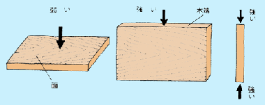 @軽いものをのせる場合、斜めの支え棒(ほおづえ)でとめます。クギは、柱や壁に垂直または先端が下がるように打ってとめます。