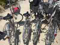 竹富島での移動手段はもっぱら自転車(レンタ・サイクル)です。 面白いのは、これら自転車には鍵がつていません。。なので(島には多くの同業店があるので、)まず借りた後にはスグに写真を撮っておいて番号など確認できるようにしておきます。 |