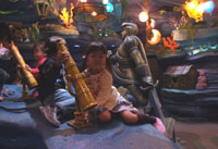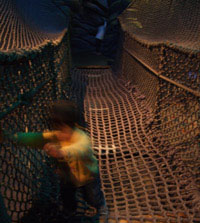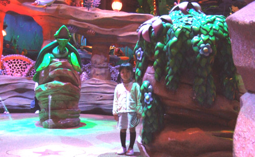 海草の迷路や、宝探しをしながら洞窟を探検するアトラクションです。 ロープや網のはしごを渡ったり、水の飛び交う広場があったりと、東京ディズニーシーならではのコーナーで子供には人気でしたが、少々暗いので(活発な子供だったら)スグに見失ってしまうようなところです(※勿論、迷子になるわけではありません)。 |