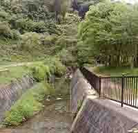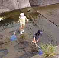 隣を流れる小川は部分的に舗装してあり、子供などもそこに下りて安全に遊ぶことも出来ます。ただし、小魚がいるような深さでもなく、うちの子はアメンボ採りをしていました。 |
