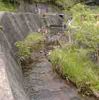 川幅だけでなく長さも短い川で、3〜400mくらいしか無いと思います。(基本的に側面をコンクリート舗装してあるため)とても清流釣りが出来る場所ではありませんが、それでも何人かは魚釣りをされています。まあ、小さな子供には非常に安全な釣り場ではありますが・・。 広場のスグ横を通る快適な水空間といったところですかね。 |
