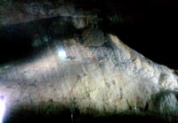 白い石灰がまるで雲のような天井と、頂上部分が雲に突っ込んだ富士山のように見えることから洞内富士と呼ばれています。洞窟の中で最大の石筍で、1万年〜2万3000年前に形成されはじめ堆積している地形のようです。 |