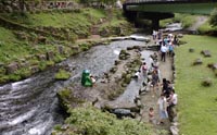 滝つぼから橋の下をくぐって下流にいくと少し整備されていて、ゆっくり腰を下ろして景色を楽しんだり、小さな子供であれば川遊びをしたりできます。 |